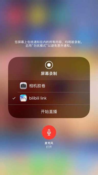 第五步:使用3D touch 用力按“屏幕录制”(若没有3D touch功能,则长时间按住即可),然后选择哔哩哔哩直播姬,打开麦克风(显示为红色即为已打开)
