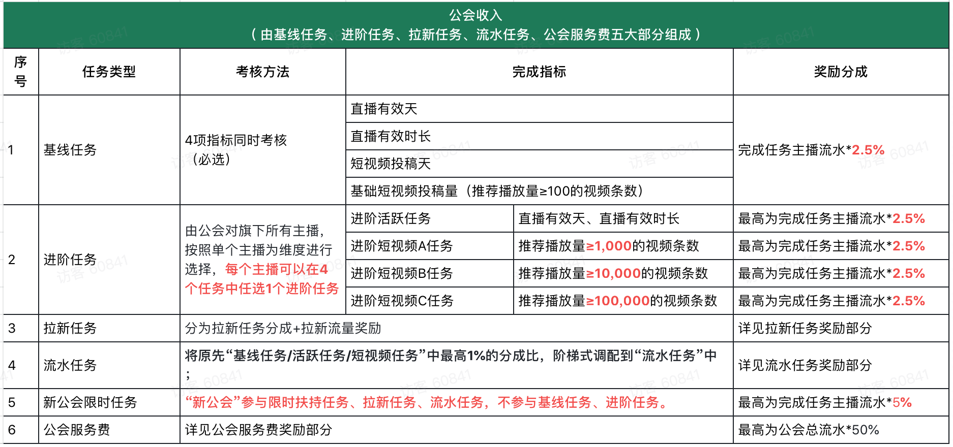 - 考核单个主播的任务完成情况,同时达成基线任务的四个指标,则公会可以获得该主播本月流水*对应奖励分成比的基线任务奖励。