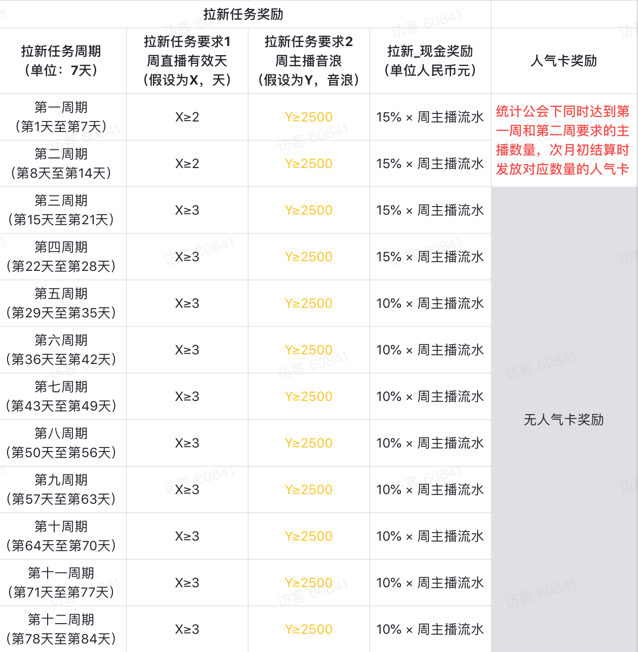 - 单个拉新主播从第五周期(第29天) 开始,流水计入老主播流水第一周期至第四周期期间公会就单个新主播所获得的现金奖励.上限为7.5万元(单周上限) ;第五周期至第十二周期期间公会就单个新主播所获得的现金奖励上限为6.7万元(单周上限)