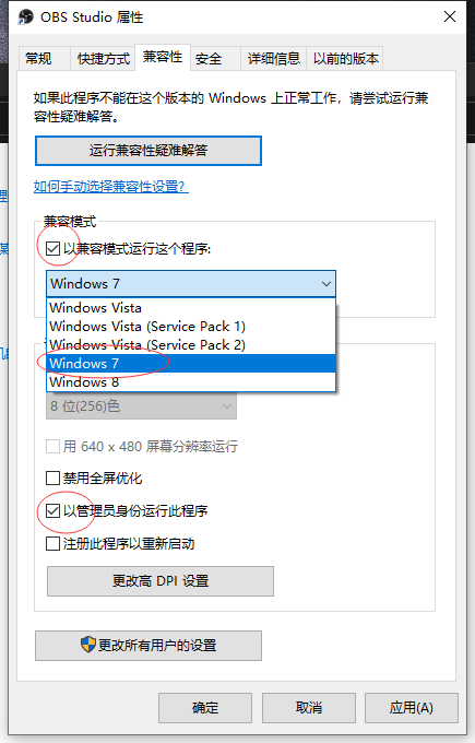 方法一:打开OBS软件“属性”——“兼容性”——“以兼容模式运行这个程序”选择Window7,并勾选“以管理员身份运行此程序”。
