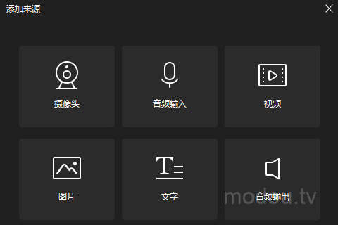场景来源支持:摄像头、音频输入、视频、图片、文字、音频输入