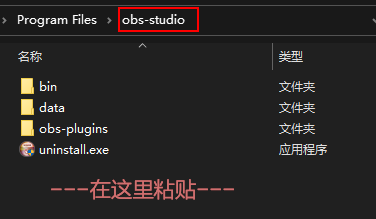4、将复制的三个文件(data、obs-plugins,presets)粘贴到obs-studio文件夹内,如果提示是否覆盖或替换,选择”是“即可!
