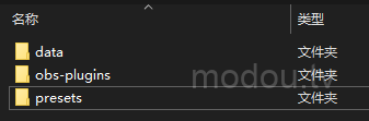 1、 下载文件后解压缩,将获得三个文件夹(data、obs-plugins,presets),复制这三个文件(data、obs-plugins,presets);