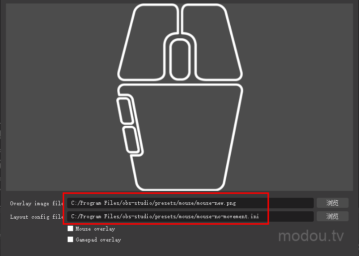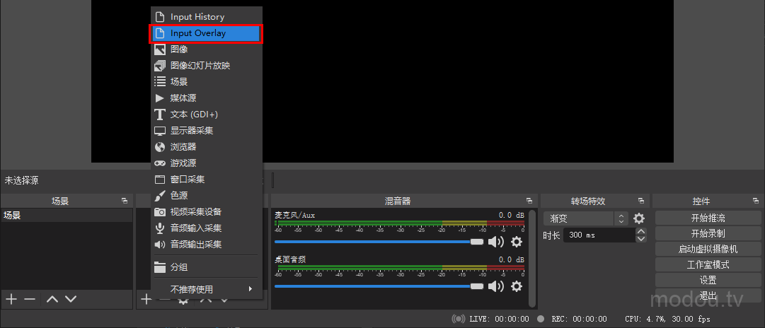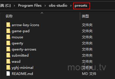 7、要想在电脑中显示鼠标按键,操作方法雷同,在来源中添加“input-overlay”—在预设文件夹“presets”中打开“mouse”文件夹