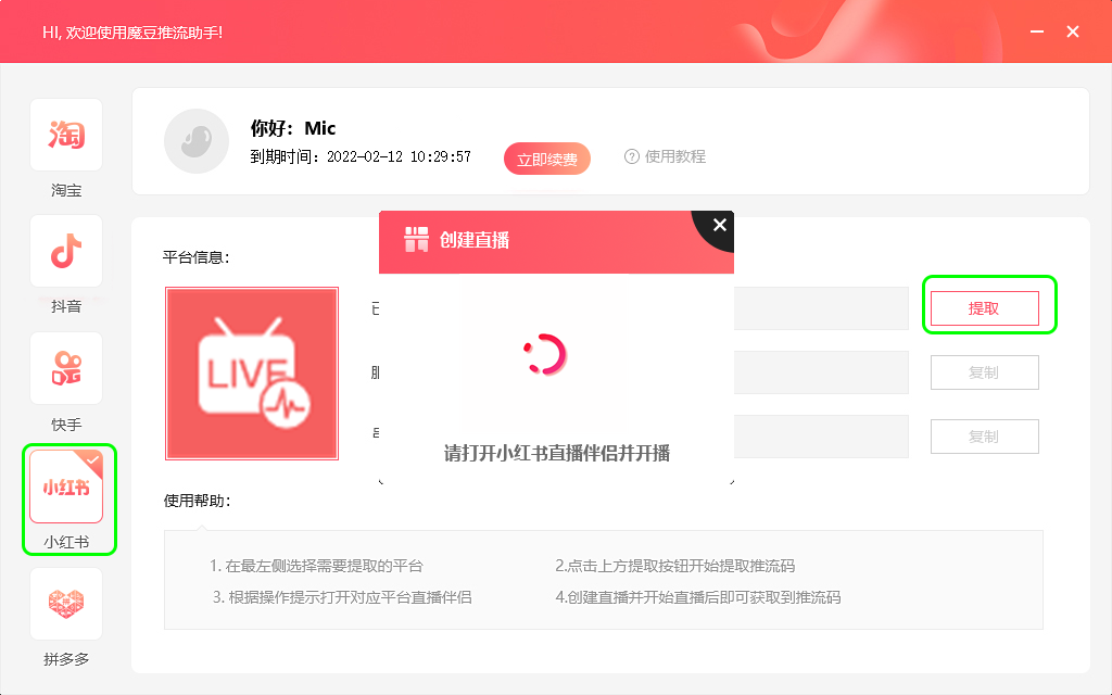 2、打开魔豆推流助手,输入账号、密码后点击登录,登录后,选择小红书平台,然后点击“ 提取 ”