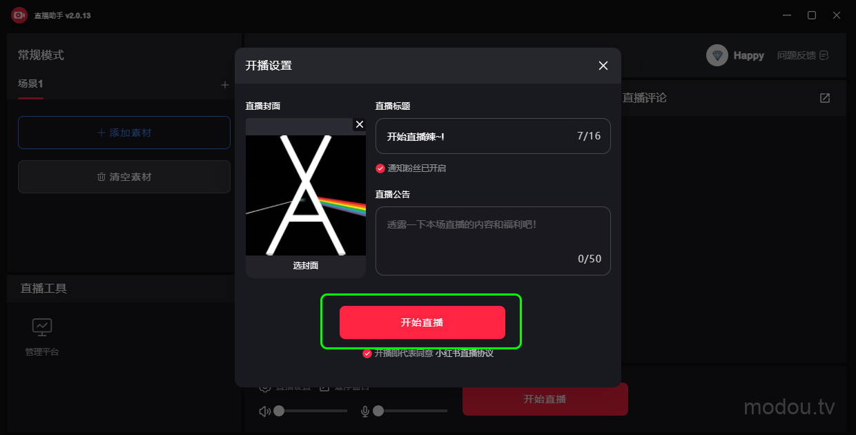 3、弹出“请打开小红书直播伴侣并开播”等提示框后,打开小红书直播助手,输入直播标题和封面后,点击开始直播