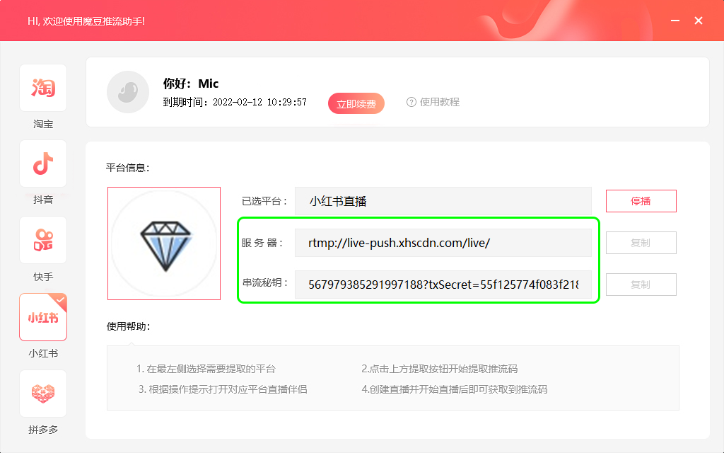 4、此时,小红书软件会关闭,魔豆推流助手中已经获取到小红书推流地址