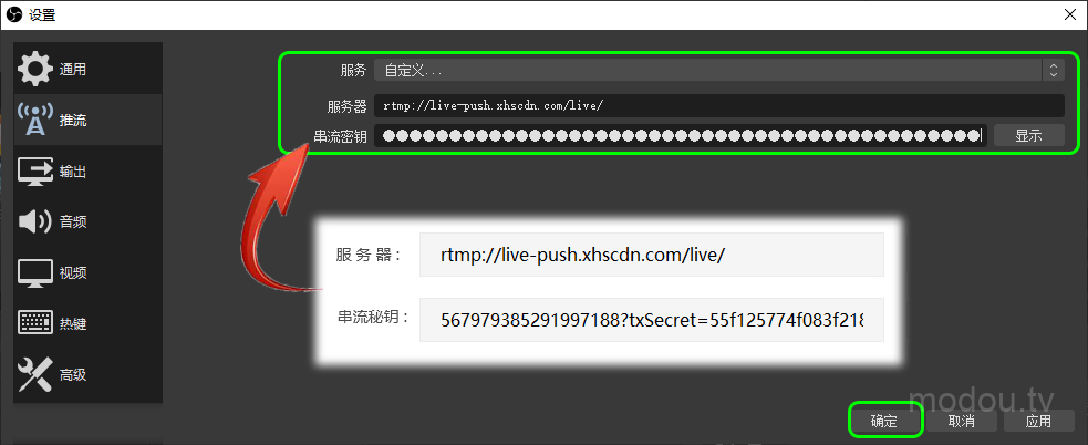 5、打开OBS设置,选择推流,服务选择“ 自定义 ”,将魔豆推流助手中获取到的服务器地址,复制粘贴到OBS中的”服务器“中,将串流密钥复制粘贴到OBS中的“串流密钥”中,点击“ 确定 ”