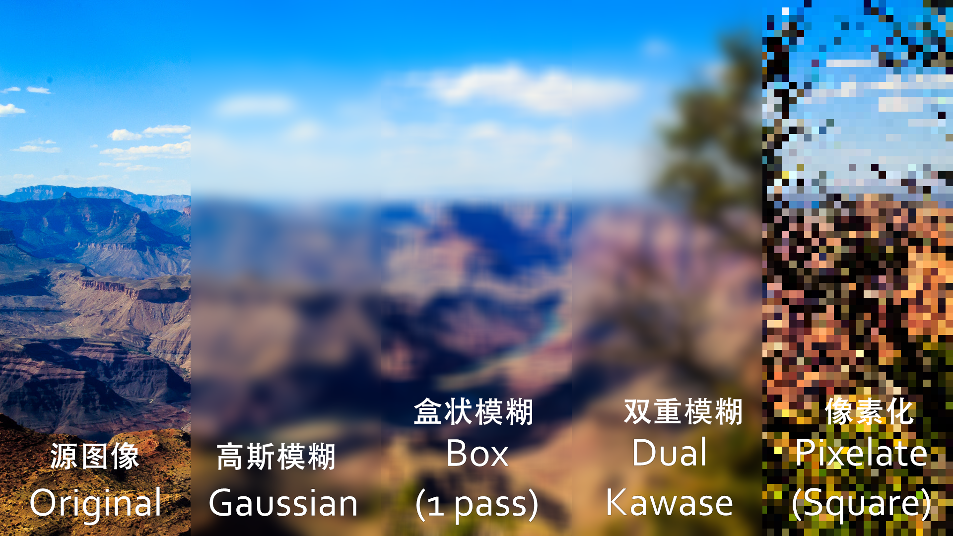 Dual Kawase是一种模糊算法,它使用向下采样和向上采样来模糊图像。它具有高质量的模糊,几乎没有伪影,并且在计算上具有效率,特别是在更大的模糊值下。然而,Dual Kawase的天真实现在模糊方面有非常大的跳跃——基本上每一步的模糊度都会增加一倍。这种实现牺牲了少量的效率,但在最后的下采样步骤中使用线性插值允许中间模糊值。这使模糊值持续变化。Dual Kawase最常见的用途是当您需要非常高的模糊半径时,但通过此实现的线性插值步骤,它也可以用作一般模糊。由于算法的工作方式,只有区域模糊可用。