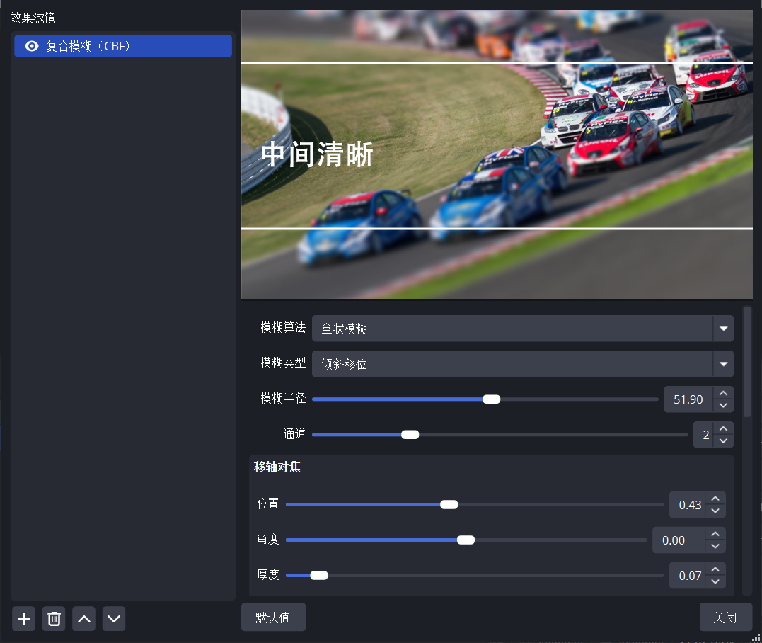 倾斜移位模糊定义了焦点平面,由帧中的位置和厚度指定。焦点平面以外的所有像素的模糊值越远,其模糊值就越高。由此产生的图像给人一种扭曲的规模感,使大物体看起来像微型模型。当应用于城市街道等视频场景时,效果可能很显著。可调节的输入是模糊半径、对焦平面角度、对焦平面位置和对焦平面厚度。
