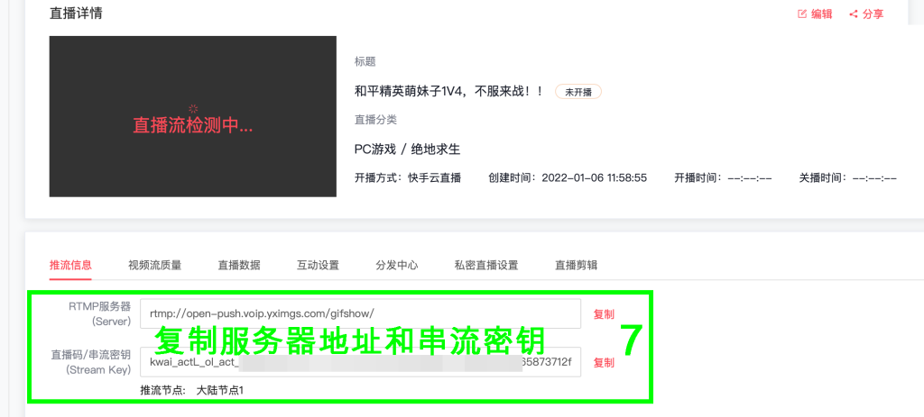 此时就已经提取到了快手直播平台的服务器地址和串流密钥,将服务器地址和串流密钥复制