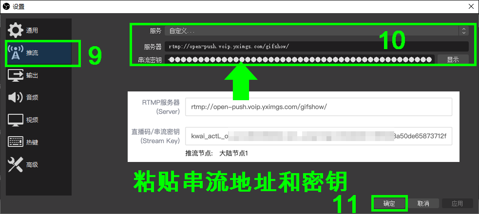 点击「推流」—服务选择「自定义」,将提取到的服务器地址和串流密钥粘贴到OBS中