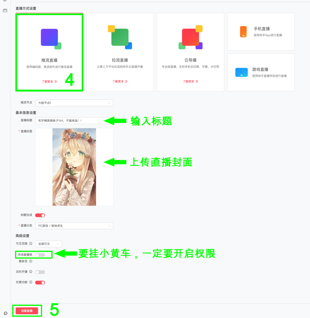 选择「推流直播」,输入直播标题,上传直播封面(提示:如果要挂小黄车,一定要开启直播带货权限),完成后,点击「创建直播」;