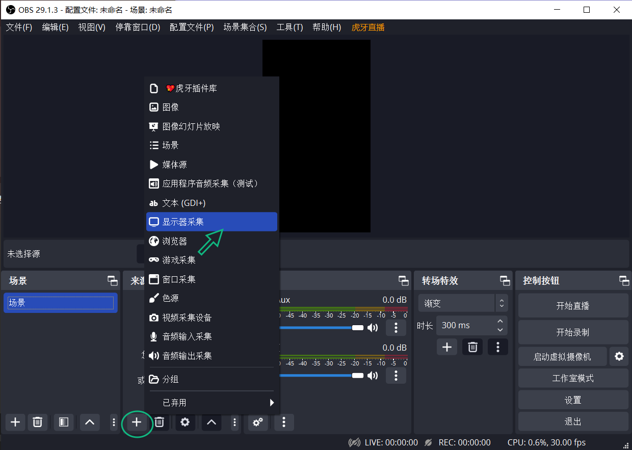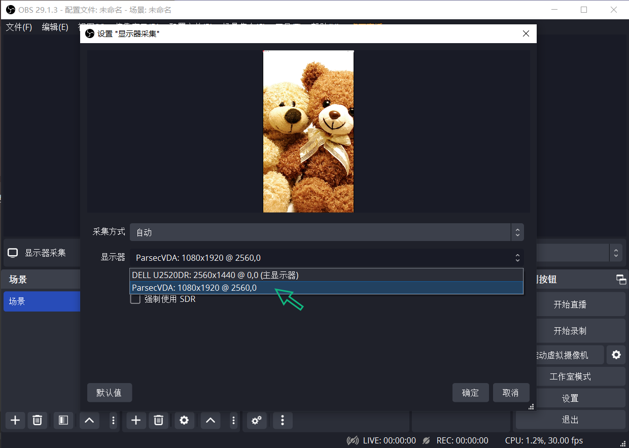 3、OBS来源下依次点击“+”——“显示器采集”——显示器选择“Parsec….”开头的——“确定”