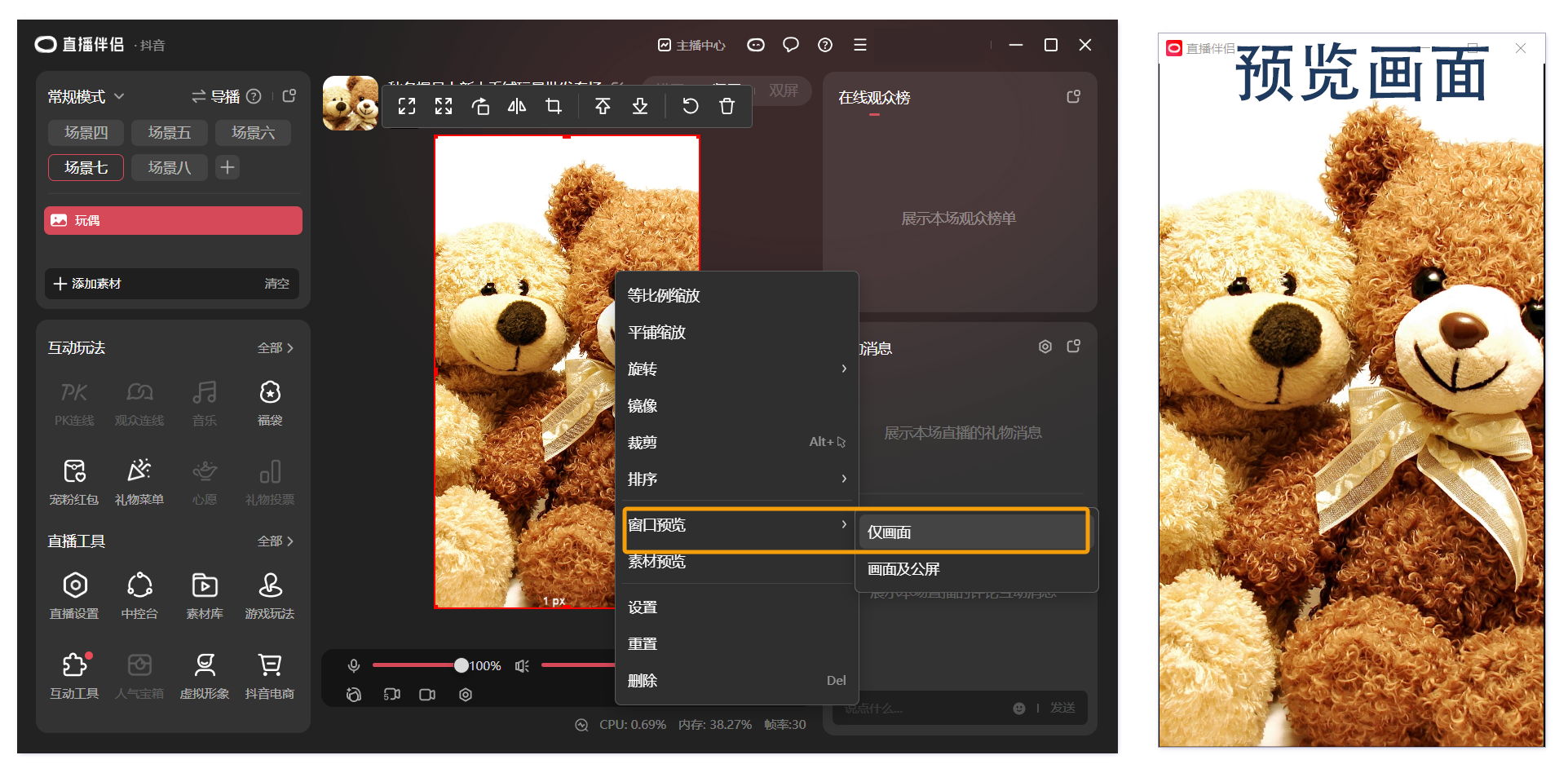 鼠标在画面右键,依次点击“窗口预览”——“仅画面”,将画面以单独窗口显示;