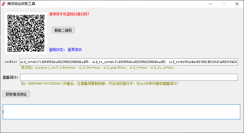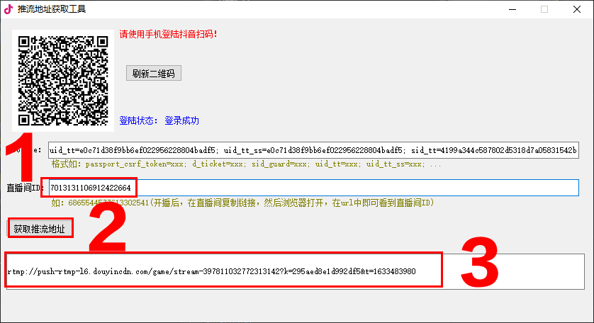 第六步、将浏览器中的直播间ID(reflow/以后的数字)粘贴到推流码获取工具中的“直播间ID”栏,点击“获取推流地址”;