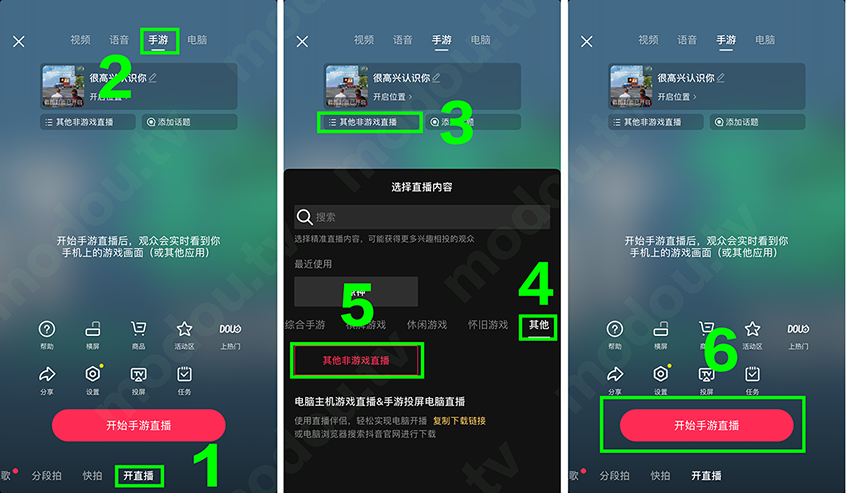 第三步、打开抖音APP,依次点击“开直播”——选择“手游”——“选择直播内容”——“其他”——“其他非游戏直播”——“开启手游直播”;