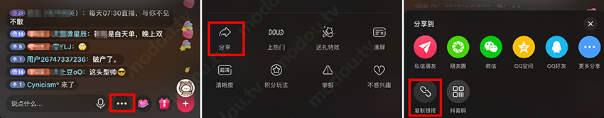 第四步、进入你的直播间,点击“…”——“分享”——“复制链接”;