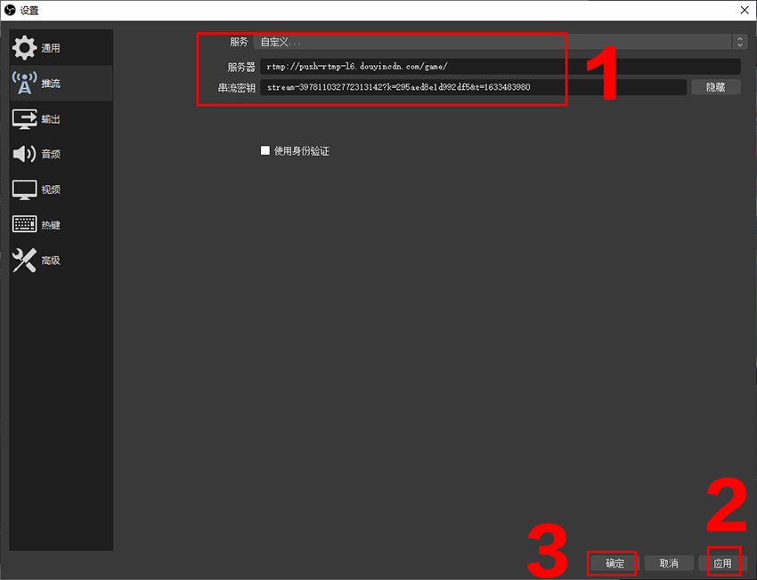 注意:stream前面部分是服务器地址,stream到结尾是串流密钥;