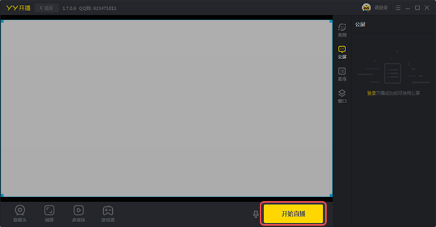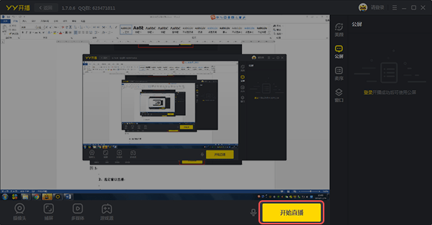 ③点击开始直播,即进行全屏直播; 注意,全屏直播看到预览画面有重复是正常的,因为画面在不断重复捕捉整个屏幕,将YY开播工具最小化后就正常了;