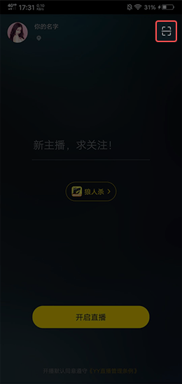 ③手机打开YY手游助手,点击右上角的扫描功能,扫描YY开播的二维码进行投屏:
